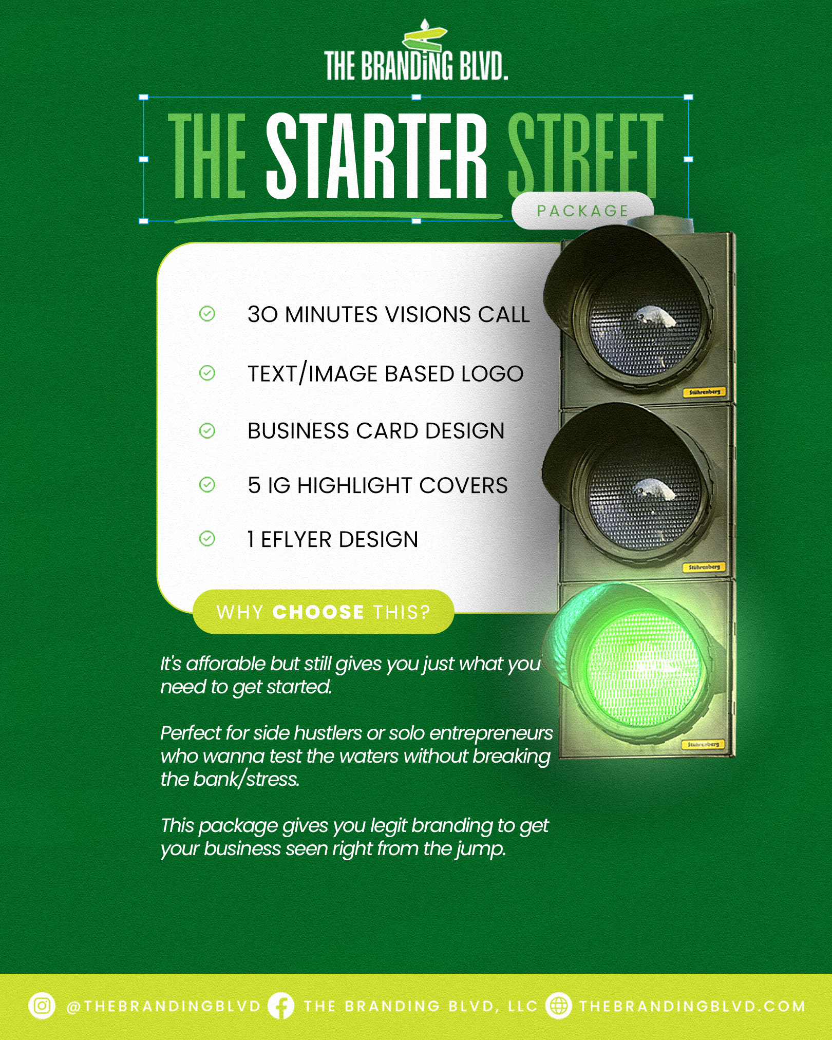 Maybe you're just getting started or dipping your toes into entrepreneurship but that don’t mean you should look basic. This package gives you the essentials to pop out the right way : clean, professional, and ready to be seen. If you done with the DIY and you tryna step correct from day one, this one’s for you.